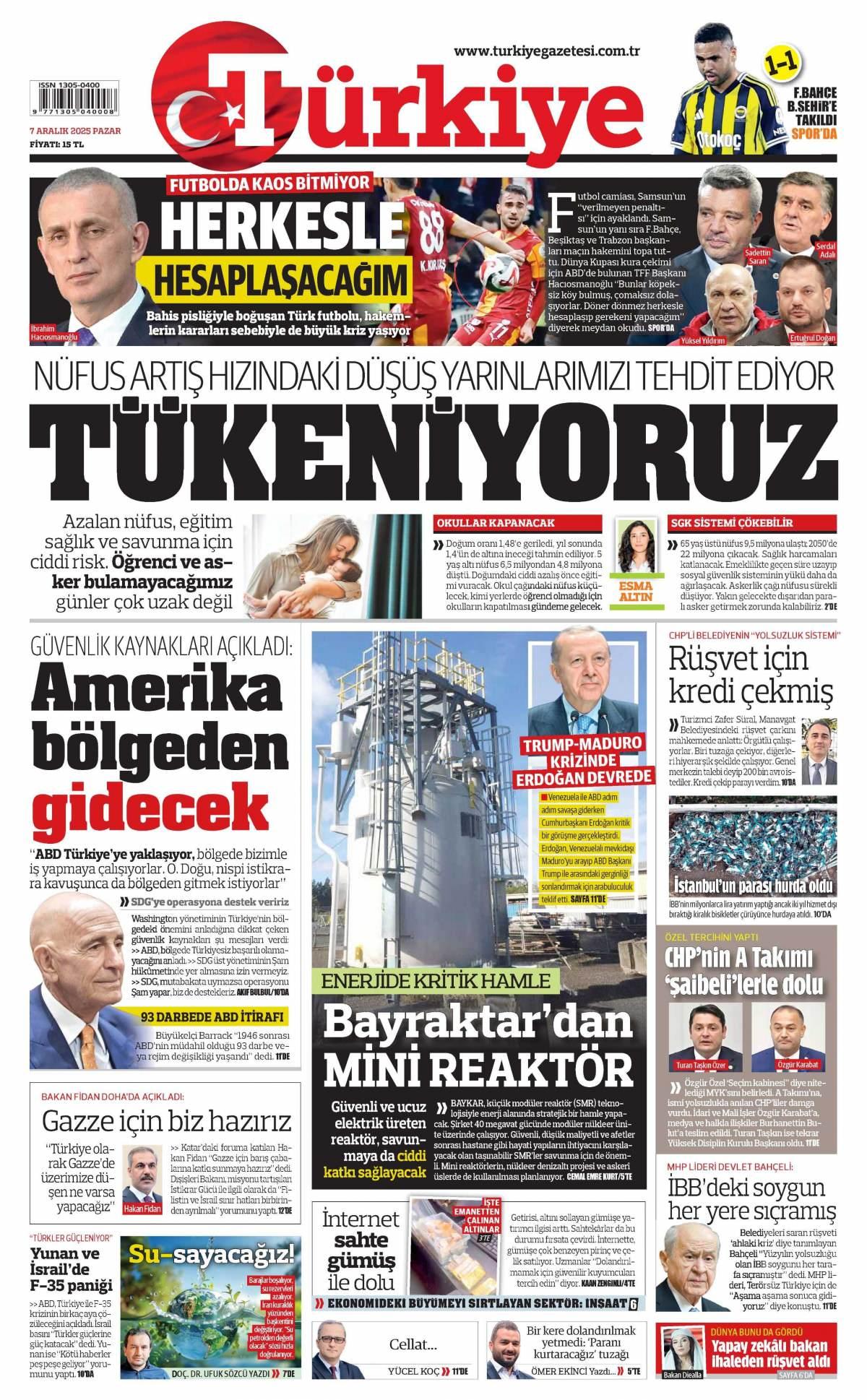 Türkiye Gazetesi 7 Aralık 2025 Günü Manşeti